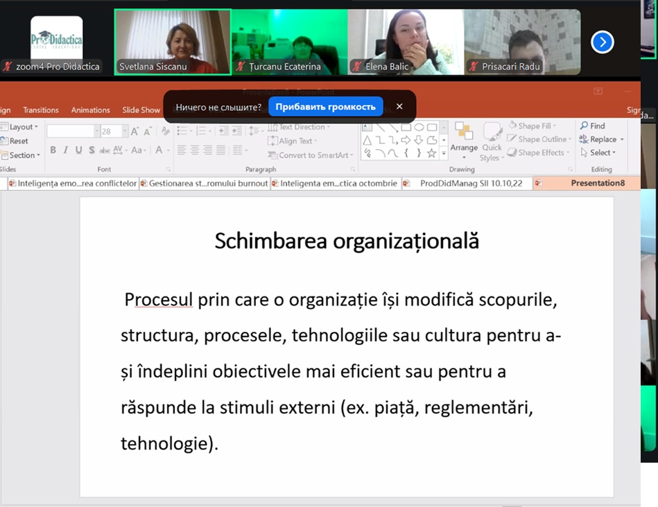Ediția curentă a programului ”Managementul educațional”, acreditat de Agenția Națională de Asigurare a Calității în Educație și Cercetare, a avut astăzi ultima activitate, cea de follow-up. Derulată în format online în perioada 1 octombrie-14 noiembrie 2025 și facilitată de formatorii Svetlana ȘIȘCANU și Daniela VACARCIUC, aceasta a întrunit 19 cadre manageriale din învățământ.