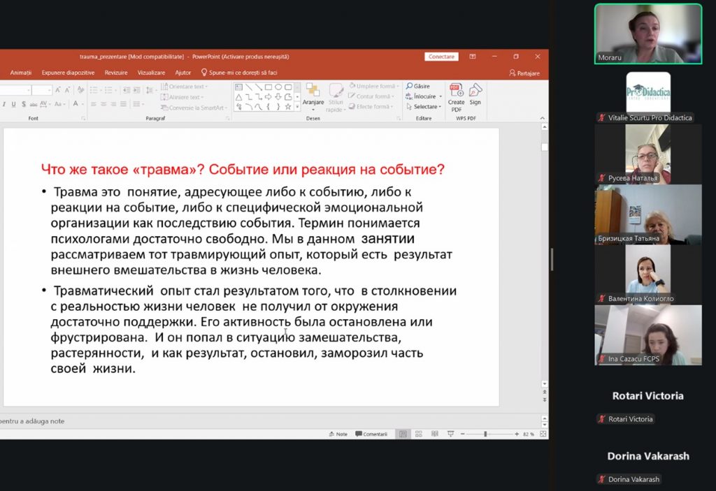 Programul ”Asistență psihosocială pentru copii și tineri refugiați din Ucraina”, desfășurat la distanță în perioada august-octombrie cu psihologii din cele 7 centre comunitare de educație online (Digital Hub), s-a încheiat. Moderat de către formatoarele Elena Creangă și Ina Moraru, acesta a avut drept scop să-i pregătească pe cursanți pentru activitatea cu fete și băieți din rândul refugiaților și din comunitățile gazdă, în vederea oferirii de sprijin psihosocial și psihopedagogic celor afectați de traume și de violență bazată pe gen, dezvoltării rezilienței psihosociale, depășirii dificultăților de învățare.