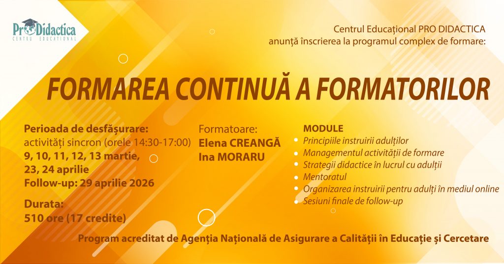 Centrul Educațional PRO DIDACTICA anunță înscrierea la programul complex FORMAREA CONTINUĂ A FORMATORILOR (17 credite / 510 ore), acreditat de Agenţia Naţională de Asigurare a Calităţii în Educație și Cercetare.